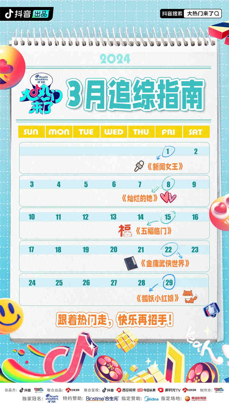 還想再給龍年的自己加點歡樂能量?那就繼續蹲住《大熱門來了》解鎖更多精彩時光,3月高能不斷,千萬蹲住了!收下這份3月追更日歷,大熱影劇《新聞女王》《燦爛的她》《五福臨門》《金庸武俠世界》《狐妖小紅娘》主創團即將紛紛登場!現在上抖音搜索“大熱門來了”,提前預約下期節目精彩,3月追綜我們不見不散!