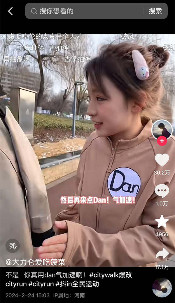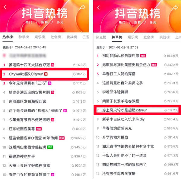 基于對用戶生活趨勢的洞察,抖音電商發布「2024年早春跑步穿搭趨勢」——Cityrun,發起 #citywalk爆改cityrun 創意話題,邀請明星、達人以分享運動跑步日常及運動裝備等形式進行主題種草。同時,平臺聯動頭部品牌,以優質創意內容構建營銷新場景,幫助品牌打造跑步趨勢代表新品,實現品牌品效雙收。截至3月12日,#cityrun 話題獲得1.1億次播放,#citywalk爆改cityrun 話題播放量突破9800萬次,#穿上風火輪才是超燃cityrun 話題播放量超2000萬次。至此,Cityrun“風”真正吹起來了。