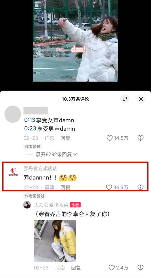 2月23日,抖音達人@大力侖愛吃菠菜 發布了一條視頻,配文“打籃球的時候一定要喊qiao!dan!!!”。喬丹官方旗艦店賬號空降評論區,評論了一條“喬dannnn!!!”,直接收獲36.3萬點贊。前有“Damn使龍城free將在”,后有“喬damn”,品牌網感直接拉滿。網友表示:“沒想到點開評論區是這出兒”“官方也玩梗”“笑死我了”……玩梗玩嗨了的用戶們涌入喬丹直播間,在直播間以梗互動,品牌低成本實現了直播間引流。