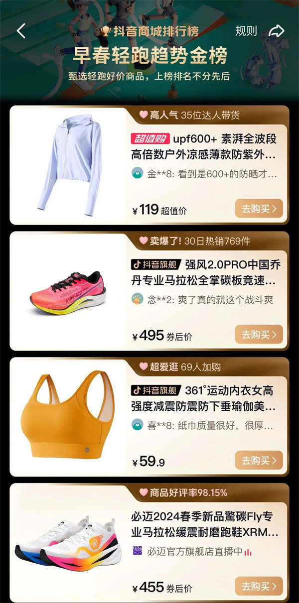 抖音電商服飾行業本身有較強的勢能,在用戶中間也已經很大程度上建立了“優價好物”的心智。本輪活動結合“早春輕跑趨勢金榜”,進一步驅動品牌提供優價好物,提升消費者的決策效率和購物體驗。從品牌視角出發,趨勢金榜作為抖音電商新的種草觸點,集合了平臺權威性和大眾口碑。上榜品牌的品牌力得以進一步提升,趨勢金榜從而促進品牌更好地推新,提升獲客和轉化效率。