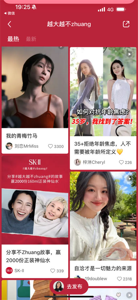 對(duì)當(dāng)下的真實(shí)洞察,正是SK-II始終能贏得消費(fèi)者青睞的原因。在小紅書上,SK-II 聚焦“脫美役”這一現(xiàn)象,發(fā)起 #越大越不Zhuang # 話題,鼓勵(lì)用戶分享自己的故事,通過更多真實(shí)、鮮活的案例,為女性的活法給出參考答案。