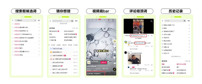 抖音搜索則進一步降低了搜索門檻,在種草內(nèi)容中不需要憑空輸入關(guān)鍵詞,一個種草內(nèi)容可以關(guān)聯(lián)到的引導(dǎo)搜索形式有:搜索框候選詞、猜你想搜、底部視頻bar、評論吸頂詞,通過這些多元化的搜索觸點,用戶只需要點擊,即刻進入搜索頁,獲得種草內(nèi)容的進一步信息延展。