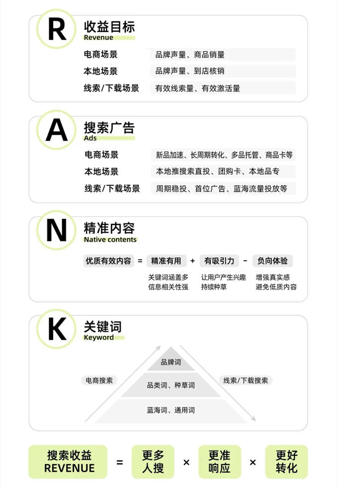 這是底層觀念的轉(zhuǎn)變,內(nèi)容種草、搜索營銷、效果成交以后就是一件事,需要同步展開,當成必選項、常規(guī)項、日常項,每個內(nèi)容在做的時候就要考慮到能不能被搜索到,能不能被用戶關(guān)注到。