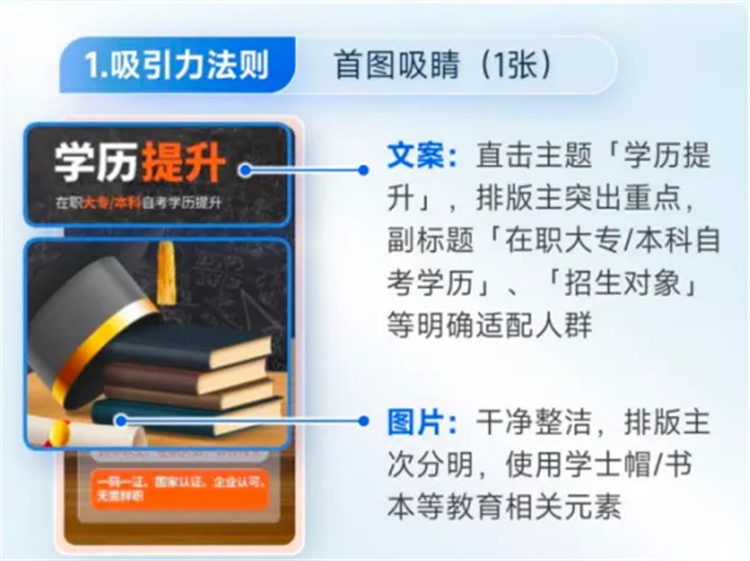 ?首圖:主標題醒目突出“學歷提升”,迅速吸引用戶;副標題精準定位目標人群,確保用戶自我代入;底部文案強調學歷含金量與學習方式的靈活性,搭配與教育相關的底圖,營造學習氛圍,增強用戶興趣。