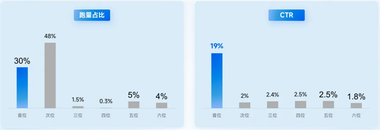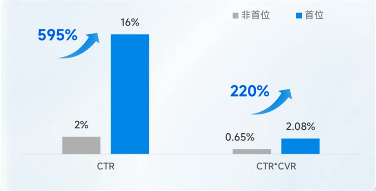首位廣告是指在搜索場景下,滿足相應條件后搜索結果首位展現的廣告內容。相比較非首位廣告,排在搜索結果首位展現的廣告內容,曝光更高、跑量更快、轉化更高。據統計,原二位廣告提升到首位后,跑量提升60%;首位廣告平均CTR為16%,高于非首位595%。