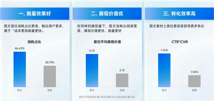 在跑量、展現和轉化方面,圖文上首位相較視頻也具有明顯的優勢。圖文素材上首位時,跑量效果更好,消耗占總體消耗的比例更高,是視頻消耗占比的1.65倍,觸達用戶更多,跑量更快;展現價值優,同樣展現量下,圖文消耗更高,流量表現更佳,圖文的首位平均展現價值幾乎達到視頻素材的2倍;轉化效率更高,圖文的轉化效率(CTR*CVR)數據比視頻環比高出近13%。