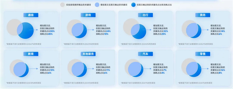 圖文獨有的拓流優勢,體現在商家在投放時圖文,可觸達到視頻廣告無法觸達的搜索詞,沉淀更多精準流量。數據顯示,當大盤圖文滲透20%時,圖文可額外投出的關鍵詞占比8%,且分行業趨勢來看,圖文占比越高的行業,額外投出的流量占比更高。以出行旅游行業為例,當搜索圖文占總體搜索內容的54%時,僅圖文觸達到的關鍵詞占比達32%,消耗占比25%。