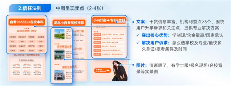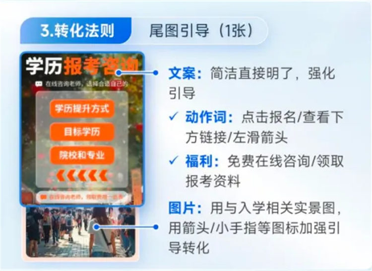 ?尾圖:遵循轉化法則,從用戶關心的實際問題切入,如目標學歷、報考選擇等,引發用戶共鳴;提供福利資料,如免費試聽、優惠報名,作為解決方案亮點。并配以明確的引導語與咨詢按鈕,鼓勵用戶采取行動,實現興趣到轉化的轉變。