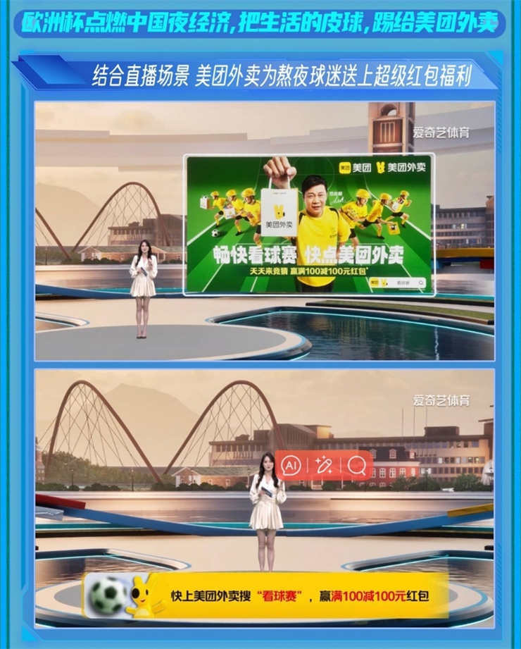 轉播技術創新,同樣能給品牌客戶帶來新體驗。本屆歐洲杯,愛奇藝體育全新升級了XR超級直播場景,讓用戶在終端實現360度全場景沉浸式觀賽。為了契合當下球迷的即時觀賽與分享的需求,愛奇藝體育還在直播中增加“官方互動主持人”全程互動,實現陪伴式觀賽。創新的轉播場景,更是為品牌客戶在賽事流量高峰期提供了豐富的露出方式。