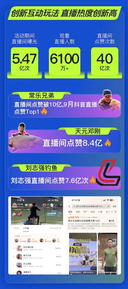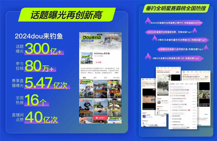 在抖音垂釣全明星賽的熱度助推之下,本次活動以其獨特的魅力席卷抖音。垂釣全明星賽霸榜全網熱搜,上榜全國熱搜16次。#2024抖音垂釣全明星新銳賽、 #常樂兄弟垂釣嘉年華點贊破3億、 #鄧剛劉志強曾大盆同框釣魚 登錄全國熱搜榜Top1,參與投稿作品數量超80萬,直播間點贊超過40億次,引發全網熱烈關注。