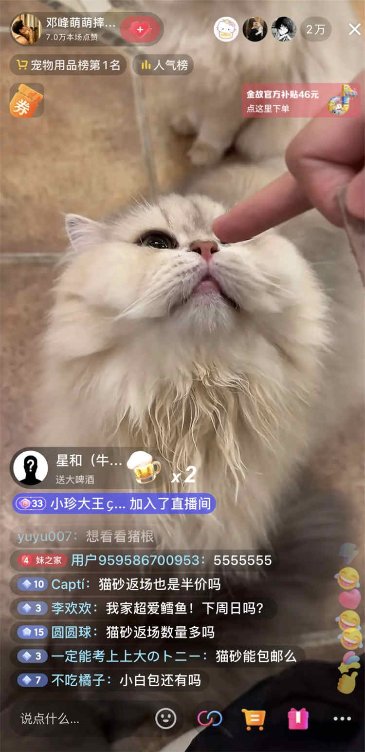 寵物內容賽道中的主角永遠是寵物,而不是人。這就是場景化直播內容的價值,不必做聲嘶力竭的叫賣,把養貓成果直觀展現在用戶面前,貓咪就是最好的主播。今年雙11,@鄧峰萌萌摔腫了在特色且有效的直播策略下取得了很好的轉化。