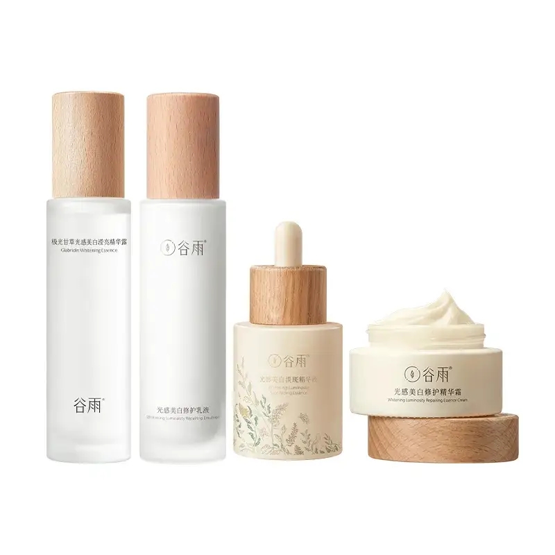 比如源自中國傳統節氣養生文化的品牌谷雨,不僅提出了“依時依令,有效護膚”的溫和護膚理念,在包裝設計上也堅持傳統文化的運用與輸出,沒有花里胡哨的外觀設計,簡單的圓柱形瓶身+原木蓋子極具新國風風格。