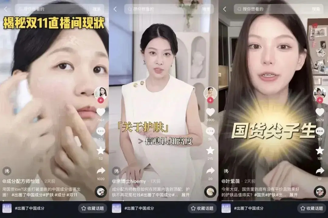今年雙十一,抖音電商洞察到品牌“中國成分”力量與用戶消費習慣,推出了“出圈了中國成分”主題活動,利用全域興趣電商的生態優勢,聯合一眾KOL,邀請他們參與活動傳播、進行成分種草,消費者在看達人們推薦同時,不僅學到護膚小知識,也更信任本土品牌的成分實力。