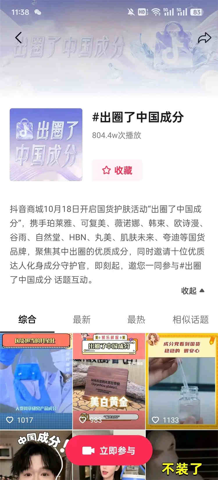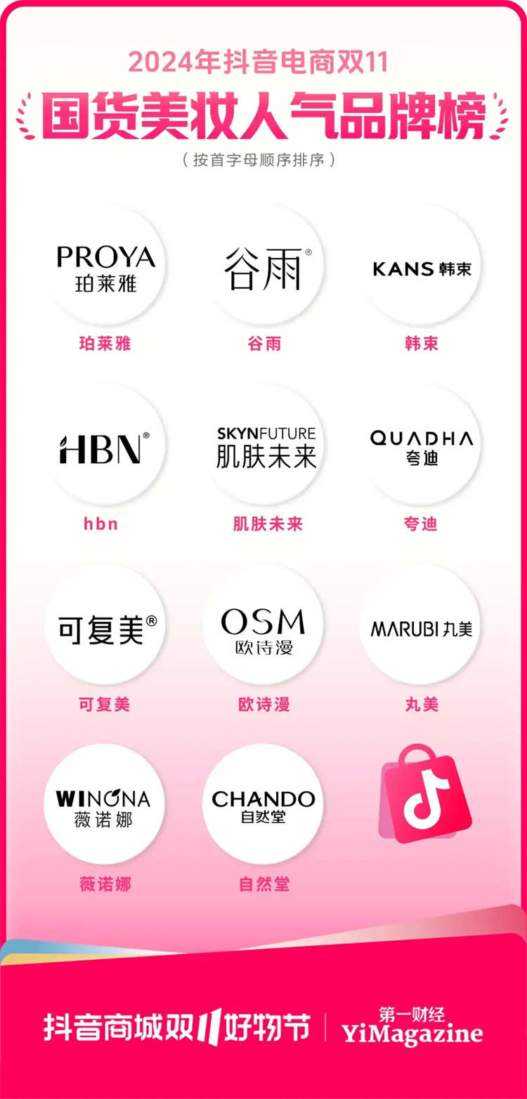 美妝是抖音優勢類目,深受用戶喜愛。去年9月起,近400家國貨就在抖音自發聯動營銷,實現了流量、聲量和銷量的全面飆升。這也是諸多國貨美妝品牌“all in 抖音電商”的決心。今年的雙11期間,基于對品牌營銷需求的敏銳洞察以及對消費者囤貨熱情的精準反饋,平臺再次精準把握市場脈動,依托強大的資源整合能力推出了“出圈了中國成分”主題活動,為國貨美妝品牌提供了大量資源和生意機會。