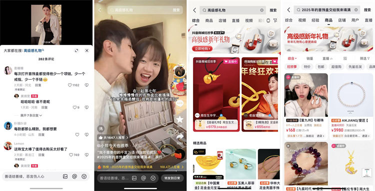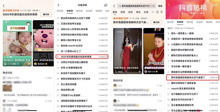 在優質達人內容的帶動下,#2025年的首飾盒交給我來填滿、#新年氛圍感穿搭被珠光寶氣拿捏了 分別登上抖音種草榜TOP30、抖音種草榜TOP9 ;同時,與話題#高級感禮物 #高級感新年禮物 聯動 ,多個話題累計播放量超1億。話題不僅精準地捕捉到了消費者的心理需求,更借助達人多樣化的敘事,將珠寶潮奢的價值與人們的生活場景、情感體驗緊密聯系在一起,成功為“高級感新年禮物”活動導入更精準的流量。