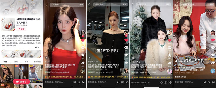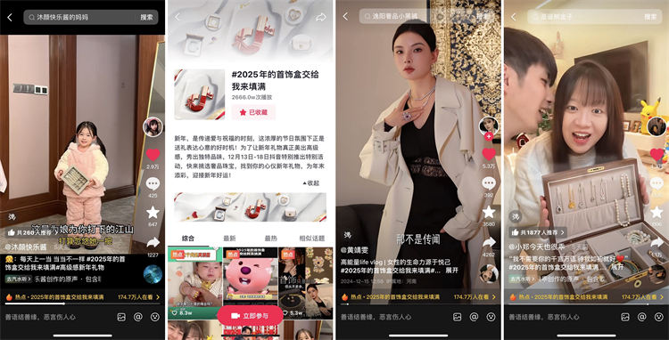 內容型直播間熱火朝天,話題內容與資源布局緊隨其后。活動期間,抖音商城推出#2025年的首飾盒交給我來填滿 、#新年氛圍感穿搭被珠光寶氣拿捏了 兩大熱點話題,不僅吸引眾多達人的內容投稿,也引發了大批珠寶潮奢愛好者的共鳴與討論。