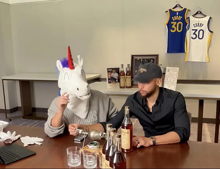 其間,穿插著產品分享,兩人中間擺了幾瓶威士忌。庫里熟練地介紹起威士忌的特點、釀造工藝,但嘴里的爆米花一直沒停過,稱贊“真的很不錯”“能排進我的爆米花榜單前五了”,最后還用中文和觀眾們說了“謝謝”。
