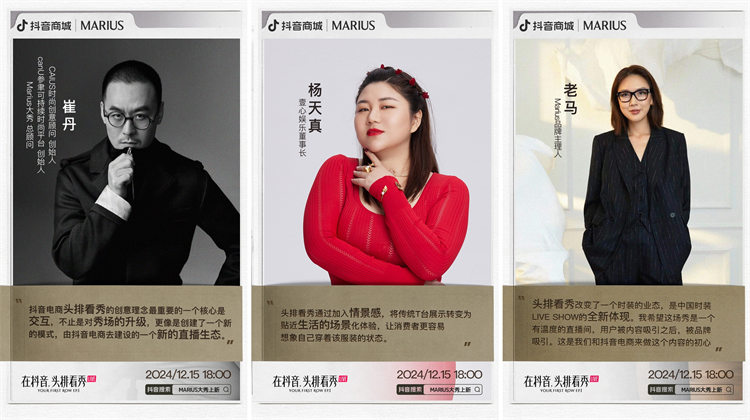 去年12月,紅人品牌老馬Marius 通過合作抖音電商「頭排看秀」項目,借著新品發布的機會,落地首個「沉浸式劇場型」直播大秀。宛如“坐在大秀頭排”的獨特體驗,使其區別于常規的時尚秀場,為用戶留下了更深刻的印象。