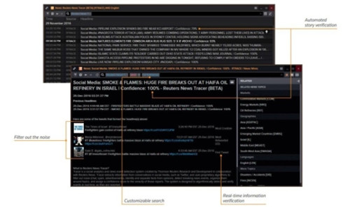 社交平臺Twitter上,一款叫做ReutresNews Tracer的工具被用來監測隨時出現的各類新聞事件、檢測社交媒體信息的真實性。其功能亮點是:能夠實時監測社交媒體上的新聞;用算法去問記者平時可能會問的問題,倒推新聞的真實性;通過算法和機器學習挑選出哪些是新聞,哪些是廣告、謠言或一般性對話,并摘出要點,同時把相同類別的新聞相疊,組成數據;給記者和編輯提供可靠的素材和資源。