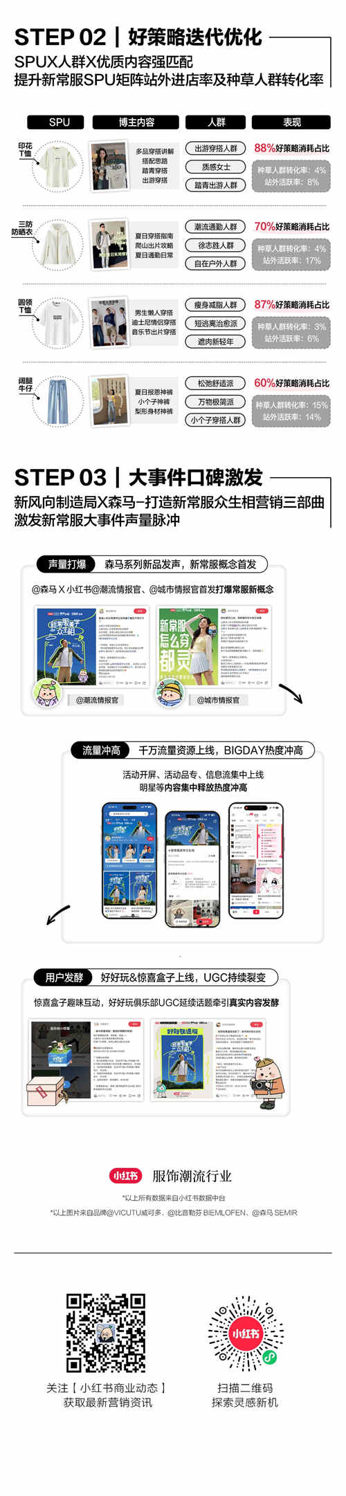 本期小紅書帶來「服飾夏日新品營銷特色打法案例」,圍繞服飾品牌夏日新品生意破圈的實戰路徑展開詳解,精選「VICUTU威可多-旅型西服、比音勒芬 BIEMLOFEN-小領T、森馬 SEMIR-新常服」三大品牌案例,深度剖析從新品到爆品的核心營銷策略,助力更多服飾品牌在小紅書看見新趨勢、發現新商機,讓好產品長出來。