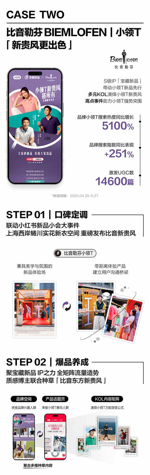 在后續轉化鏈路中,品牌運用小紅書電商閉環持續優化種草內容,實現爆品長效經營。最終,品牌小領T搜索熱度同比增長5100%,品牌搜索指數同比表現增長215%,品牌小領T新貴風成功打造夏日型格風潮。
