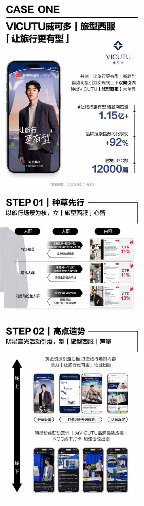 在建立新品認知后,在小紅書打造品牌高點事件,借勢明星效應實現線上引流助推,線下打卡體驗,雙渠道齊發力,進一步夯實新品「旅型西服」種草基礎;在項目期間,#讓旅行更有型 話題瀏覽量1.15億+,品牌搜索指數同比表現增長92%,成功種出「旅型西服」爆款大單品。
