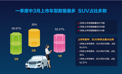 對比一季度前兩個月,3月份上市SUV所占上市車型總數的比例較一月份有所下降,較二月份有很大提升。因2月份是中國農歷的春節假期,對汽車行業市場活動有一定影響。