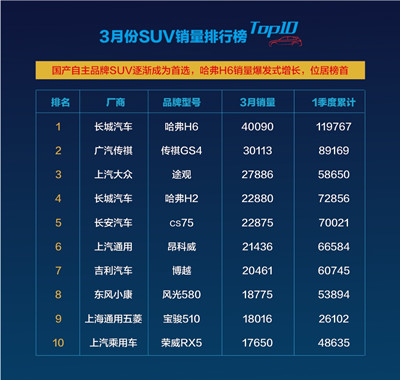 3月份SUV銷量排行榜top10