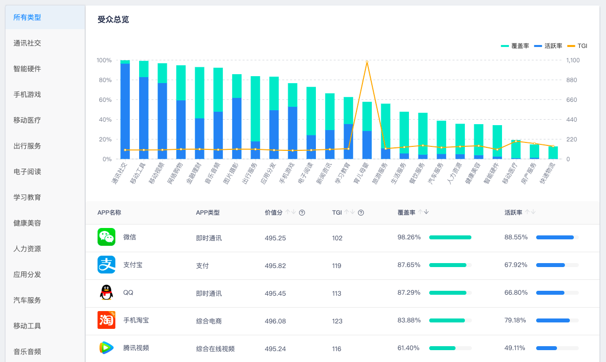 這里重點介紹下 “App 使用分析” 和 “電商行為分析” 模塊。在 App 使用分析報告中,TalkingData 可以計算處理當前受眾在 24 大類、100+ 小類的數萬款 App 的覆蓋率、活躍率、TGI 的情況,深入了解已有用戶或潛在用戶的 App使用偏好。