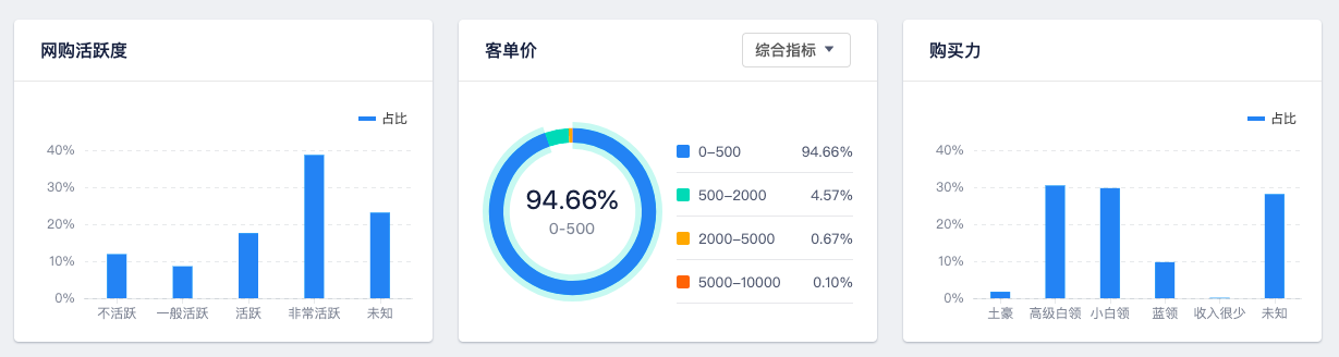 電商分析報告中,則全面的統計了當前人群的網購活躍度、購買力、消費偏好等維度的數據。