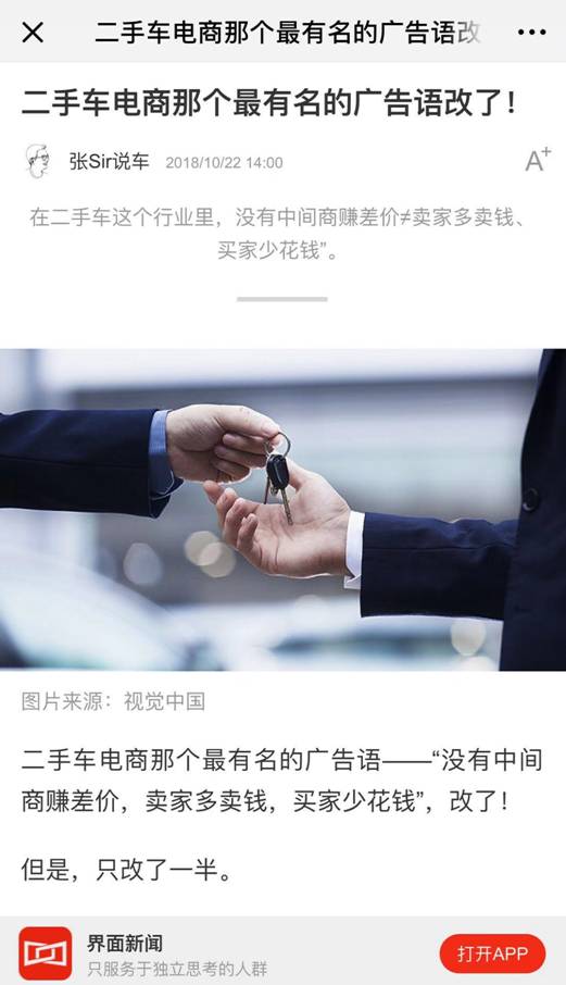 二手車直賣電商那句最有名的廣告語“沒有中間商賺差價,賣家多賣錢,買家少花錢”已悄然變臉!其最新的廣告語中已去掉了“賣家多賣錢,買家少花錢”。日前,二手車拍賣平臺天天拍車COO張延偉在其界面專欄中指出,這個變動正說明了“在二手車這個行業里,沒有中間商賺差價≠賣家多賣錢、買家少花錢”,而以“沒有中間商賺差價”為核心賣點的二手車直賣正逐漸在衰退。