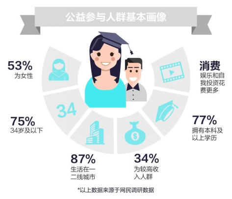 我們基于網民調研數據發現,公益人群中女性稍多,且多為已婚人士,普遍出沒在一、二線城市。在這其中,擁有三歲以下孩子的群體較為顯著,“父母”這一新角色或許讓你對大愛有了更多理解。除了身處高線級城市外,公益人士還擁有高學歷、高收入、高消費的另外“三高”特點,而非公益人群則呈現出相反的特點。