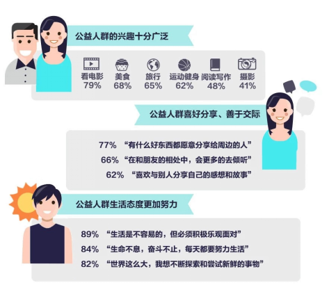 公益人群的愛好涉獵非常廣泛,電影美食、運動旅行、攝影時尚等都是你們裝點生活的方式。愛別人、更懂得愛自己的你,也樂于花更多錢在實現增值的自我投資上。善交際、愛分享的公益人群知道生活不止眼前的茍且,還有詩和遠方的田野。積極又有詩意的你,一直保持著對生活的謙卑,和對生命的熱忱。