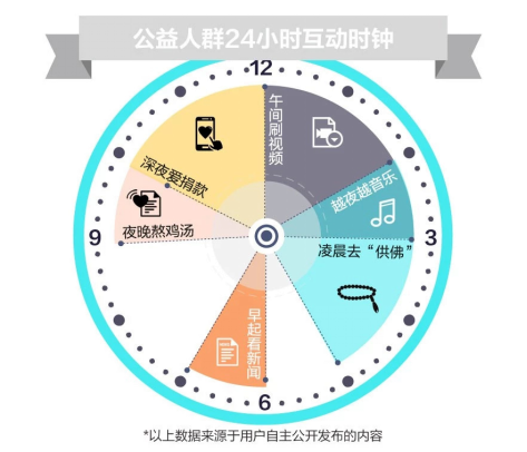 我們從社交用戶公開發布的數據來看,公益人群一天之中在社交平臺上分享的內容,呈現出“早起愛文章、午間刷視頻,越夜越音樂”的特點。你關注新聞財經,感興趣于旅游和文化藝術,會在深夜閱讀感性的療傷“雞湯文”,在一天的繁忙后心疼地抱住寄幾。你甚至會表現得非?!胺鹣怠?,在凌晨開始修身養性。