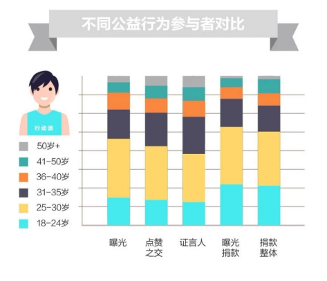 這個發現出乎意料卻又在情理之中,在質疑聲中90后已經成為了當今社會的主力軍,活躍在不同的社會舞臺,成為了公益事業中“說話少,干事多”的實干派。而已經擁有一定社會影響力的40歲及以上的公益人群,則更偏愛通過轉發的方式幫助公益項目的傳播。