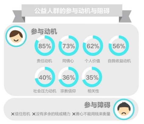 我們潛入公益人群的內心世界,發現人們參與公益的原因主要包括了希望能為社會做貢獻(85%),因同情弱勢群體或聯想到身邊人的同情心(73%),也有因收獲成就感、價值感、被依賴感得以實現個人價值的動機(62%)。