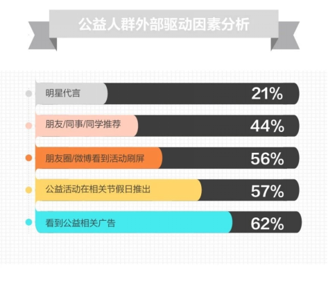 作為社交性動物,人們天然對自己的身邊人更加信任,在朋友圈、微博等社交平臺看到刷屏活動(56%),或者熟識之人的推薦轉發(44%),更會增加參與公益的概率。