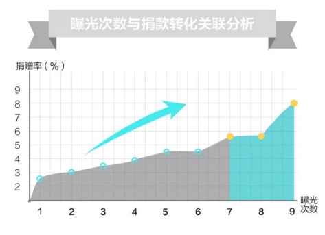 不言而喻,公益廣告曝光對捐款轉化也有著非常顯著的正向影響?!?”是一個神奇的數字,當公益廣告曝光在7次以及以上時,捐款轉化有顯著的提升。