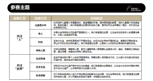 大賽延續(xù)上屆“創(chuàng)益大咖組”和“創(chuàng)益生態(tài)組”兩大組別設(shè)置,呼喚更多創(chuàng)益力量的加入。前者主要面向創(chuàng)意公司、或具有專業(yè)水平的廣告行業(yè)從業(yè)者,后者則面向NGO組織,或有志為公益項(xiàng)目提供創(chuàng)意的人士。在參賽主題方面,今年大賽設(shè)置了“關(guān)注人”和“關(guān)注世界”兩個(gè)板塊,聚焦兒童青少年、老人、婦女、特殊人群、生態(tài)環(huán)境、藝術(shù)文化、以及社會(huì)創(chuàng)新7大話題,參賽者可自由選擇命題及創(chuàng)意呈現(xiàn)方式。