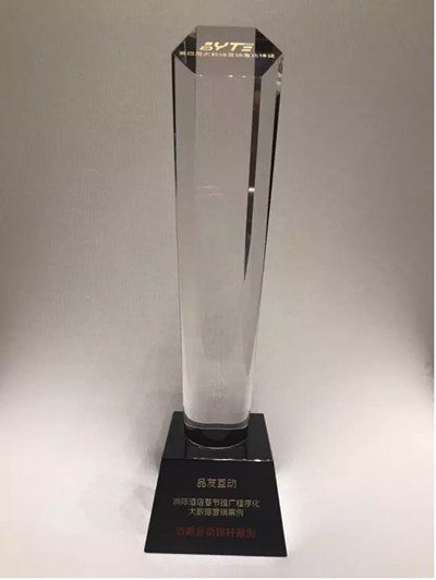 品友互動憑借中國首個智能化的數字廣告營銷云平臺“擎天柱”,憑借其透明化的智能營銷理念和產品體系強勢摘取 “年度最佳營銷云平臺”,品友擎天柱投放的洲際酒店項目摘取“年度效果標桿案例獎”,樹立效果營銷項目的新標桿。