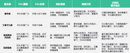 為了解決KOL評估的問題,市場上也出現了一些相關的評估方法,如榜單類、交易平臺類、數據供應商類等,幾種方法各有優缺點。