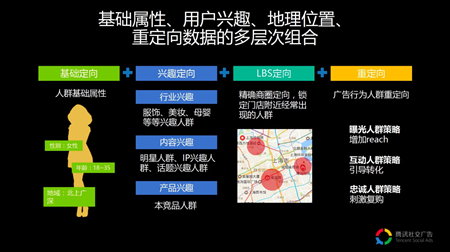 第一,定向策略優(yōu)化,深挖數(shù)據(jù),體系化運用精準(zhǔn)標(biāo)簽。騰訊社交廣告基于真實、海量的社交數(shù)據(jù),從基礎(chǔ)屬性、用戶興趣、LBS和重定向等多維度對人群進(jìn)行標(biāo)簽化分析,通過多層次定向組合幫助品牌根據(jù)不同的營銷訴求精準(zhǔn)觸達(dá)目標(biāo)消費人群,并能夠幫助時尚行業(yè)品牌進(jìn)行精準(zhǔn)的到店引流。