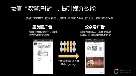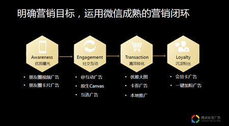 第二,場景選擇優(yōu)化,浸入生態(tài),全面考量數(shù)據(jù)和媒介策略。社交場景是一個最天然能夠跟消費者產(chǎn)生互動的地方,這是騰訊獨有的優(yōu)勢、微信生態(tài)中包含曝光、互動、轉(zhuǎn)化、沉淀粉絲等各階段豐富的廣告形態(tài),滿足廣告主不同的營銷目標(biāo),連接線上線下場景,幫助廣告主達(dá)成營銷閉環(huán)。