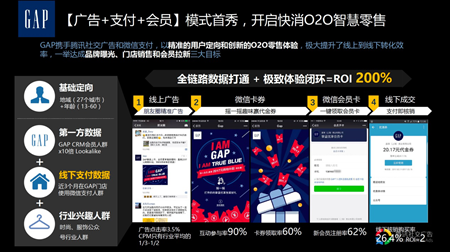 在與國際時尚品牌巨頭GAP的合作中,騰訊社交廣告為GAP打造了全行業(yè)第一個完整的“廣告+支付+會員”新模式。GAP大中華區(qū)CRM及業(yè)務(wù)發(fā)展高級總監(jiān)蔡輝介紹到,GAP于2017春節(jié)過后投放微信朋友圈廣告,用戶點擊廣告即可領(lǐng)取2017元到20.17元不等的代金券,吸引線下使用和消費,獲得代金券的同時還可一鍵領(lǐng)取GAP微信會員卡,會員卡積分變動也能夠在微信上隨時隨地查看。一次廣告投放,結(jié)合了微信支付的數(shù)據(jù)能力、微信卡包的CRM會員相似算法、騰訊社交廣告服飾子行業(yè)高精細(xì)商業(yè)標(biāo)簽人群,通過來自品牌會員數(shù)據(jù)、門店消費、騰訊社交大數(shù)據(jù)多方的數(shù)據(jù)匹配,最終為GAP找到4900萬精準(zhǔn)的潛在客戶,線下核銷率高達(dá)26%,ROI超過200%,實現(xiàn)了品牌曝光、門店銷售和會員拉新的智慧營銷。