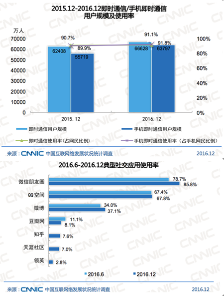 視線回到國內。上面說國內的報道并未把上述新聞串聯起來,如果要找罪魁禍首,托比網的答案是缺乏對標。在美國,我們看到了Facebook,Twitter等社交媒體成為了主流互聯網的重要組成部分;在國內,社交媒體有一個重要的定語,依附于即時通訊的社交媒體。看CNNIC第 39 次中國互聯網絡發展狀況統計報告中的兩組統計。