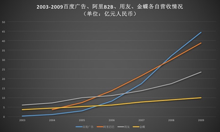 所以我們說國內不存在標準的CPC2標的。但是在中國CPC2一定有更廣闊的前景。中國目前的企業信息化仍然落后,企業特別是中小企業使用互聯網的意識正在增強,而其中對于開源(擴大營收)的需求毫無疑問遠勝于節流(流程化帶來的成本節約)。下圖反映了百度、阿里、金蝶、用友四家廠商在中國互聯網發展早期的營收情況。作為開源代表的百度、阿里巴巴,無論在中國互聯網的早期還是目前階段均穩壓節流代表的廠商一頭。