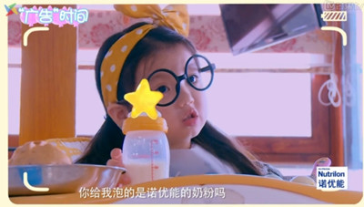 首先,除了常規(guī)硬廣呈現(xiàn),先導(dǎo)片中廣告植入又呆萌又帶感,比正片更具看點,也讓受眾一下子就記住了品牌。[NextPage]比如節(jié)目正帶的廣告時間由超萌寶寶崔雅涵友情出演,她在喝奶之前萌萌地問媽媽“你給我泡的是諾優(yōu)能的奶粉嗎?”