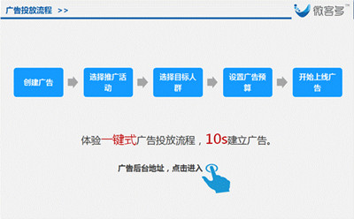 據微客多廣告業務總監蘇婷婷介紹,微客多是基于微信開放平臺對商品零售及生活服務類企業,通過入口+營銷+會員+大數據的核心理念,提供功能開發、營銷推廣、渠道管控、運營培訓等一站式互聯網化解決方案。本次推出的“微客多社交廣告”功能旨在幫助傳統商戶除利用線下用戶觸點打造流量入口外,結合騰訊社交廣告的流量資源為合作商戶增加線上引流入口;同時,依托微信擁有的海量三高(高活躍、高學歷、高消費)優質用戶,為商戶提供基于微信的線上推廣方案;利用騰訊社交廣告大數據處理算法實現成本可控、效益可觀、智能投放的互聯網效果廣告投放。
