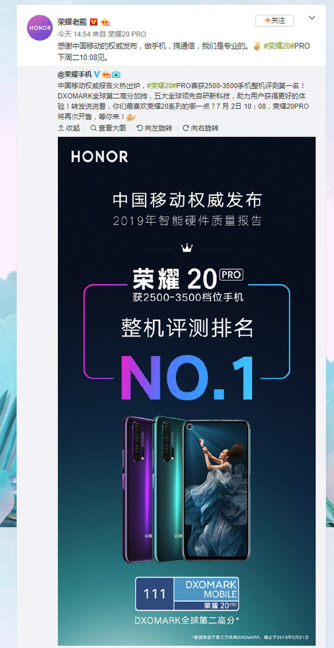 最新發布的中國移動2019年智能硬件質量報告(第一期)中華為P30 Pro擁有20 PRO在相對應的價格段獲得了整機評測的第一名。其后榮耀手機官方微博以及榮耀業務部副總裁(產品)熊軍民轉發了這條喜訊,并預告了榮耀20 PRO將會在7月2日上午10點08分再次開售。