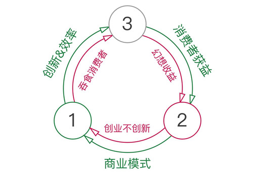 這個模型中,所有的新增價值都是消費者提供的,消費者提供的3塊錢中,1塊錢是自行車的價值,1塊錢被耗散掉了,1塊錢變成了利潤。這樣的循環是走不下去的,因為它的動力來源來自于說服或者說欺騙消費者接受質次價高的產品,這本身就違反市場規律。